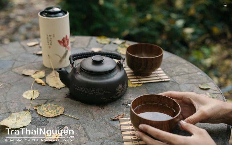 Trà được chọn kỹ lưỡng, thường là trà sen, trà lài, trà xanh, và được pha trong ấm gốm sứ truyền thống.